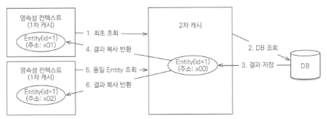 - 2차 캐시를 사용하면 엔터티 매니저를 통해 데이터를 조회할 때 우선 2차 캐시에서 찾고, 없으면 데이터베이스에서 찾게 됨