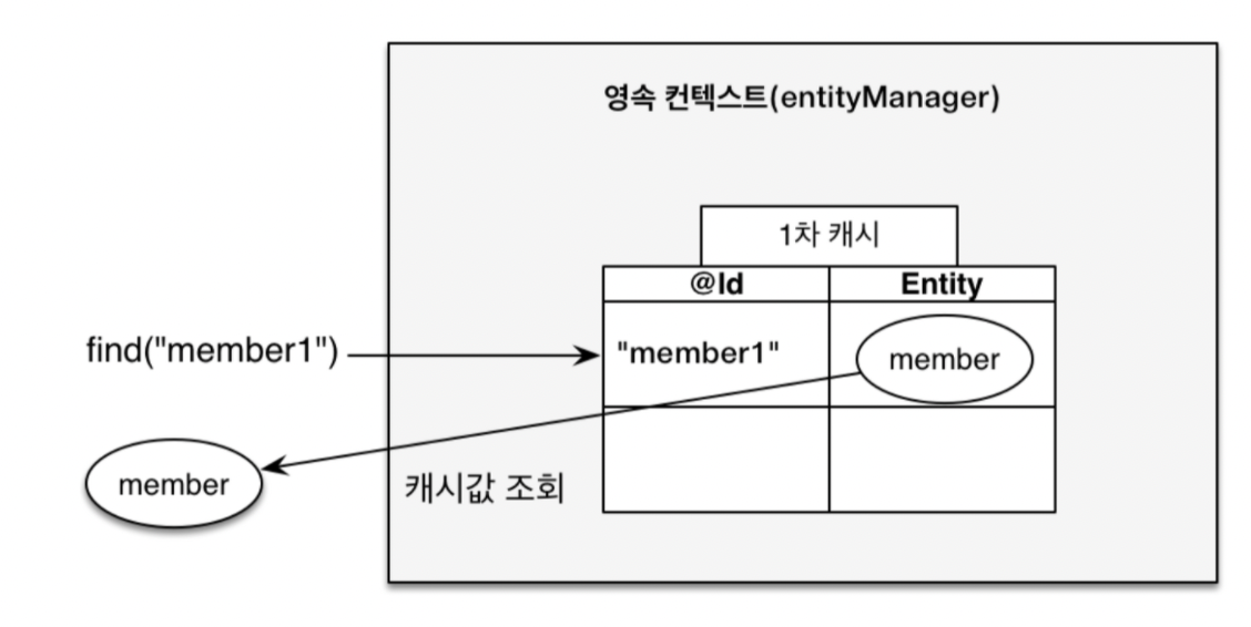 - 엔터티 매니저로 조회하거나 변경하는 모든 엔터티는 1차 캐시에 저장됨