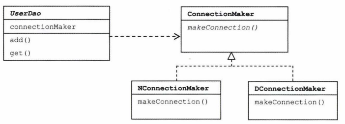 앞에서 사용했던 상속을 통한 확장 방법보다 더 깔끔하고 유연한 방법으로 UserDao와 ConnectionMaker 클래스들을 분리하고, 서로 영향을 주지 않으면서도 필요에 따라 자유롭게 확장할 수 있는 구조!