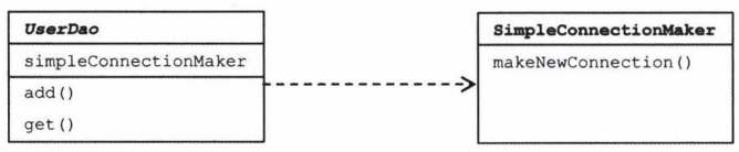 그리고 UserDao는 new 라는 키워드를 사용해 SimpleConnectionMaker 클래스의 오브젝트를 만들어두고, 이를 add(), get() 메소드에서 사용하면 됨