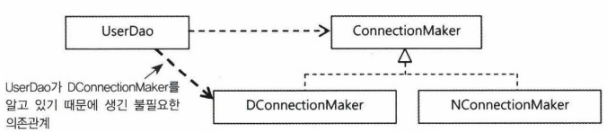 UserDao와 ConnectionMaker라는 두 개의 관심을 인터페이스까지 써가면서 거의 완벽하게 분리했는데도, 왜 UserDao가 인터페이스뿐 아니라 구체적인 클래스까지 알아야 한다는 문제가 발생하는 것일까?