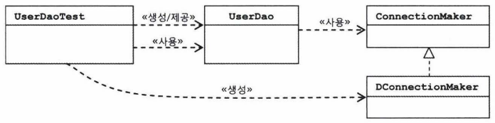 UserDaoTest는 UserDao와 ConnectinMaker 구현 클래스와의 런타임 오브젝트 의존 관계를 설정하는 책임을 담당해야 함