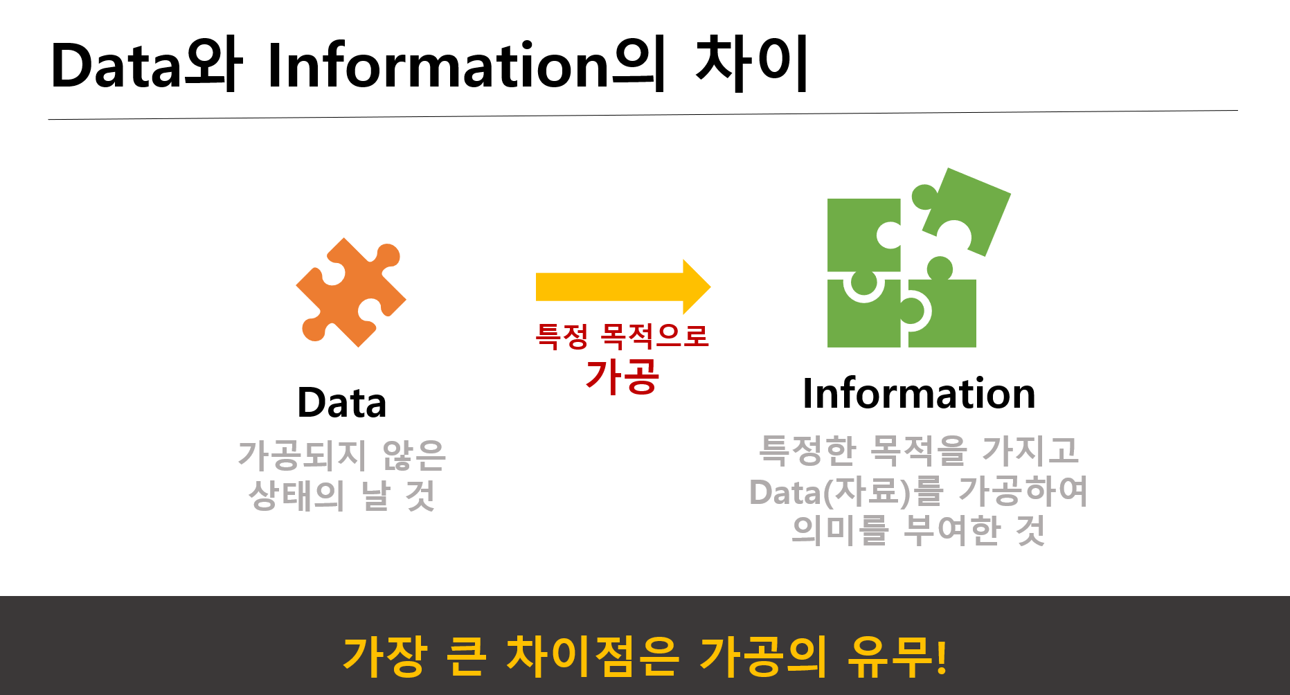예를 들어 데이터가 퍼즐 조각 하나, 하나의 낱개를 말한다면 정보는 퍼즐조각으로 맞춰진 그림인 것이다.