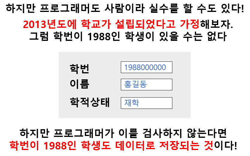 - 저장된 데이터의 내용이 의도했던 데이터의 형식과 범위를 준수해야 함