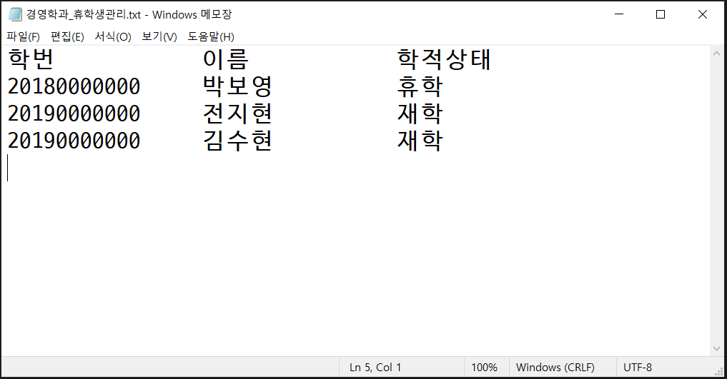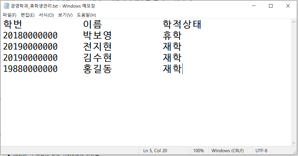 휴학생 관리 파일의 양식과 학생 관리 파일의 양식이 다른 것을 알 수 있다.