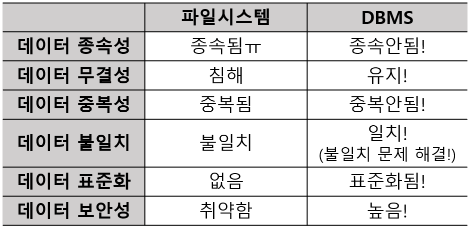 따라서 파일시스템의 문제점을 해결한 것이 DBMS이므로, DBMS의 특징을 쉽게 이해할 수 있을 것이다.