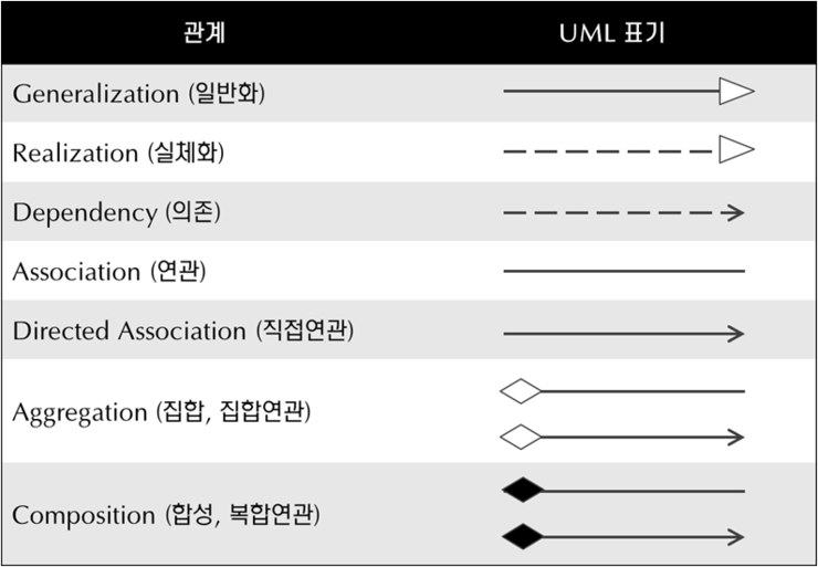 | 연관 관계(Association Relationship) | 두 클래스 간의 관계를 나타냄 (아래에서 더 자세히 설명) |