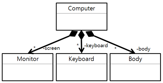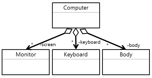 | 집합연관 | whole(몸통)과 part(엑세서리)의 관계 (몸통이 죽어도 부분은 살아남음) |