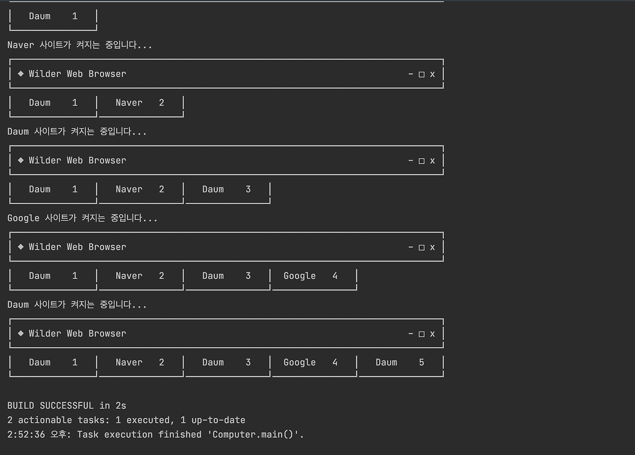 여기서 핵심은 여러 스레드에서 새로운 탭을 추가하지만, 탭이 5개를 초과하여 생성되지 않는다는 것을 알 수 있다. synchonized 키워드를 제거하고 다시 실행해 보자. WebBrowser 클래스의 createNewTab 메서드와 WebSite 의 run 메서드의 synchronized 부분을 제거한다.