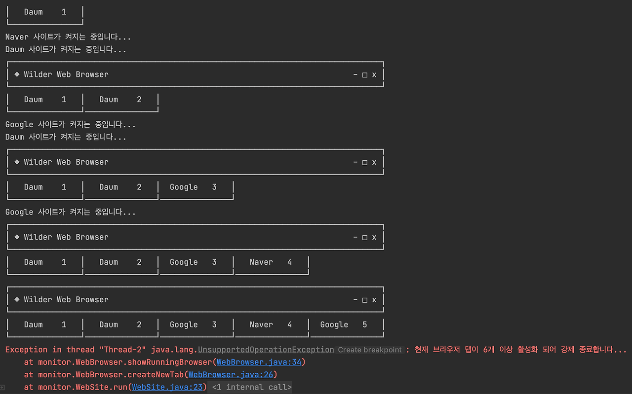 위와 같이 변경한 후 실행해 보면 스레드가 비동기로 처리되면서 6개 이상의 탭이 활성화되며 예외가 발생하는 것을 확인할 수 있다.