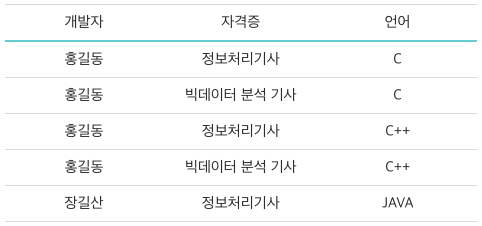 정규화 데이터베이스의 이상현상의 원인이 되는 중복성을 제거하여 무결성을 보존하는 것 제 5 정규화 조인 속성을 제거 개발자 자격증 홍길동 정보처리기사 홍길동 빅데이터 분석 기사 장길산