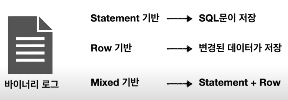 - 데이터를 대량으로 변경하는 SQL문이 실행될 경우 바이너리 로그 파일 크기가 커질 수 있다.