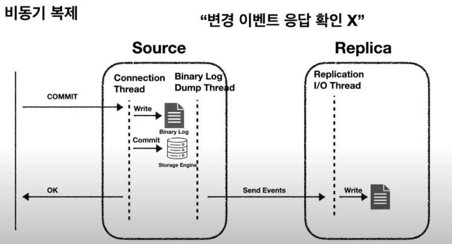Primary 노드에서 변경되는 데이터에 대한 이력을 바이너리 로그에 기록하면 Primary 서버의 바이너리 로그 덤프 스레드가 비동기적으로 읽어서 Secondary 쪽으로 전송하는 방식이다.