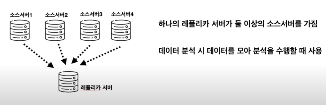 - 여러 대의 Primary 서버에서 한 대의 Secodary 서버로 데이터를 복제하는 구성