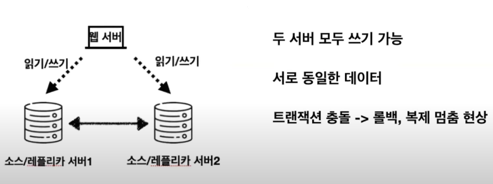 - 데이터가 양방향으로 복제되어, 높은 가용성과 데이터 동기화를 제공하지만, 충돌 관리가 중요한 과제가 됨