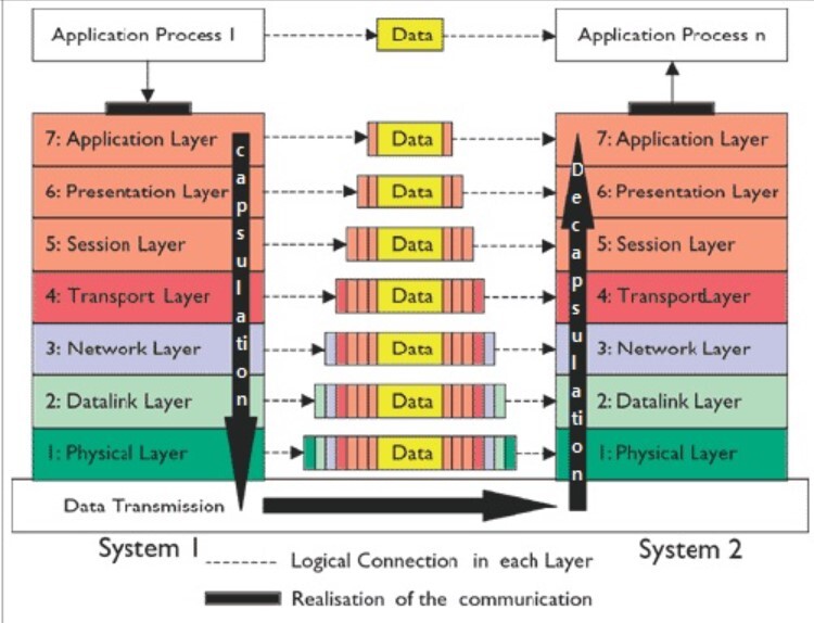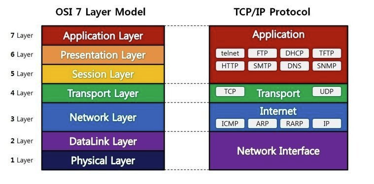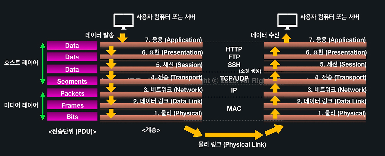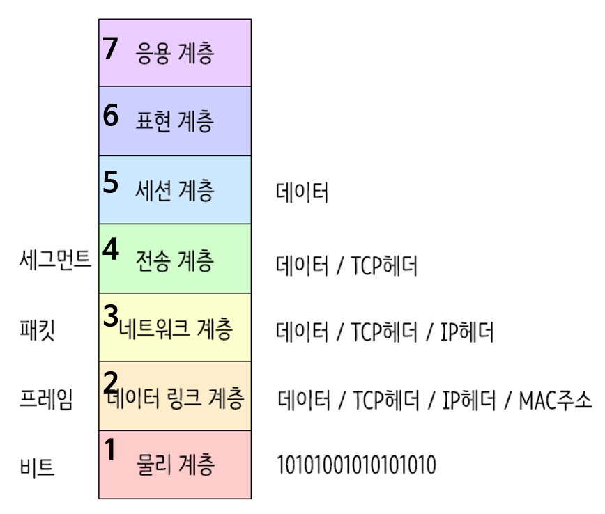 아래 그림에서 아래부터 1계층(물리 계층) ~ 7계층(응용 계층)으로 구성되어 있다.