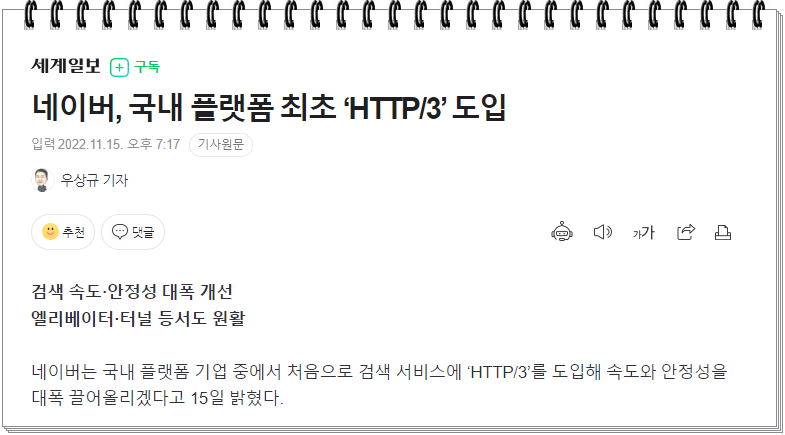 2022년 11월 15일 한국 최초로 네이버도 HTTP/3을 도입하였다고 한다.