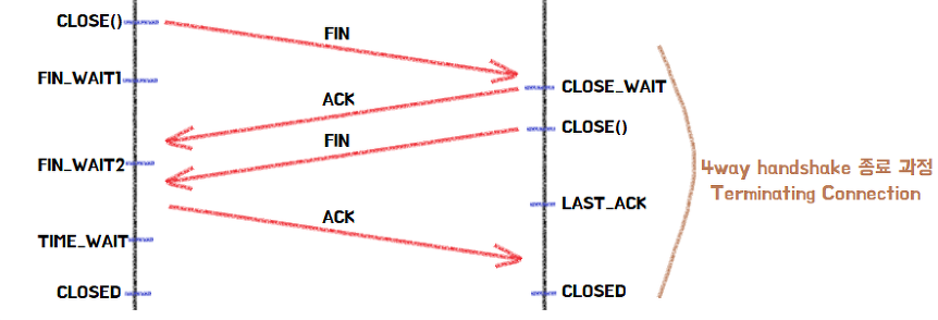 1) 서버와 클라이언트가 TCP 연결이 되어있는 상태에서 클라이언트가 접속을 끊기 위해 CLOSE() 함수를 호출한다.