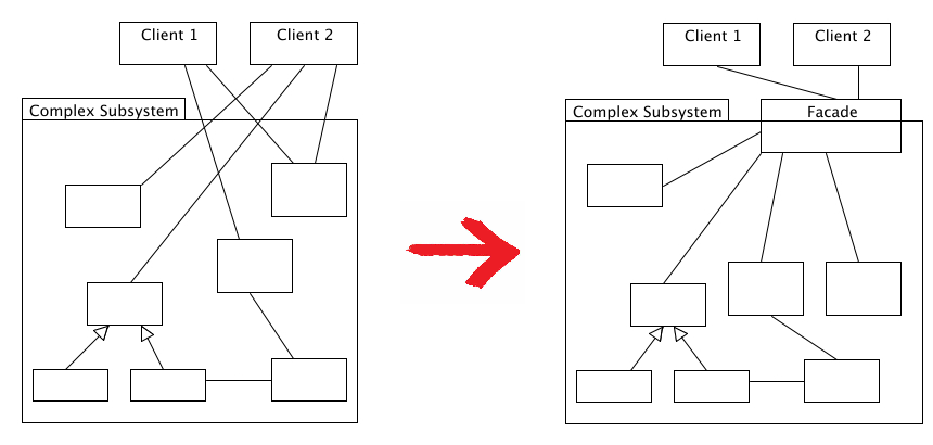 이 패턴의 주된 목적은 복잡한 시스템의 사용을 더 쉽게 만들기 위해 하위 시스템의 복잡성을 클라이언트로부터 숨기는 것이다.