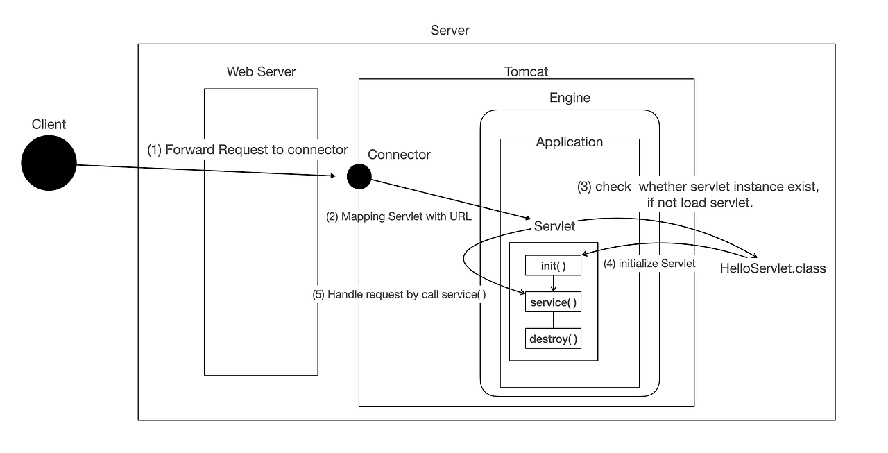 - 일단 요청이 적절한 서블릿에 매핑되면, 톰캣은 서블릿 인스턴스가 올라와있는지 체크해서 만약 존재 하지않다면 톰캣은 JVM에 의해 서블릿이 실행될 수 있게 서블릿 인스턴스를 생성한다.